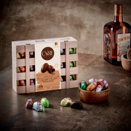 Kolekce lahviček z hořké čokolády, plněných různými druhy likérů.
