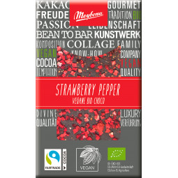 BIO bílá čokoláda s lahodnou chutí jahod a rebarbory.