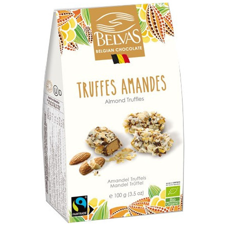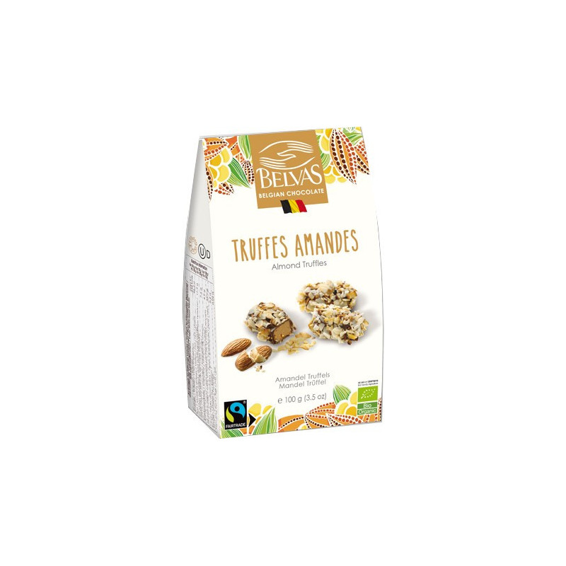 Ručně vyráběné BIO & Fairtrade mandlové „lanýže“. BEZ LEPKU, bez alkoholu. Delikátní kombinace mléčné čokolády z Peru a pražených mandlí.