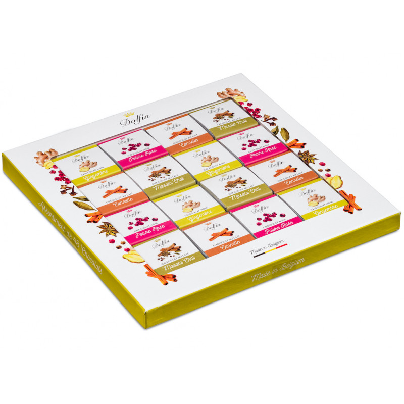 Tato pikantní kazeta vás vezme na cestu emocí: jemná směs tepla a aromatických tónů. Sortiment 48 čokoládových čtverečků složených ze 4 různých příchutí: