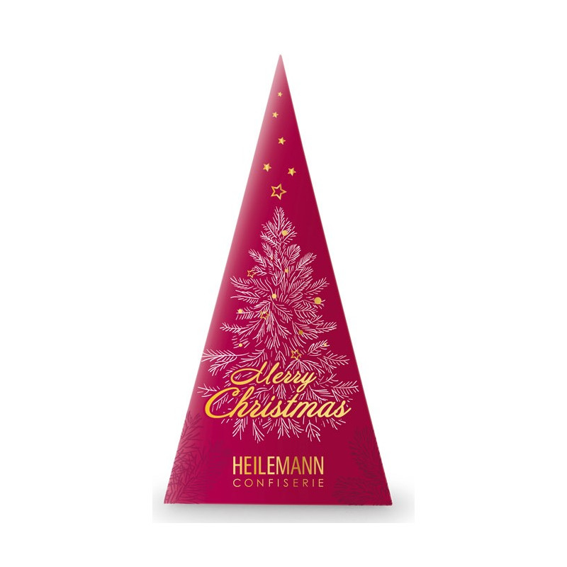 Heilemann vánoční strom "Veselé Vánoce" s lanýžovými kuličkami. Toto originální dárkové balení ve tvaru vánočního stromku, naplněné lanýžovými kuličkami je skvělým dárkem pro všechny mlsouny. Kuličky potažené tou nejjemnější bílou čokoládou a zalité šumivým Marc de Champagne, nebo hořkou čokoládou s náplní vaječného likéru, jsou speciální chuťový zážitek, který dostane každého fajnšmekra! Krabička "Merry Christmas" obsahuje šest lanýžových kuliček Heilemann o hmotnosti 15 g s vaječným koňakem nebo náplní Marc de Champagne.