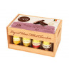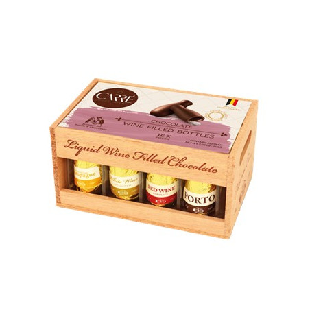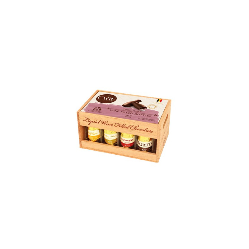 Dárková dřevěná bedýnka s kolekcí lahviček z hořké čokolády, plněných různými druhy vína a likérů.