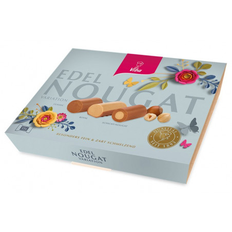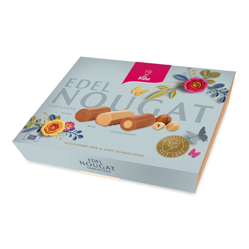 Sdílení dobrot je taková zábava! Barevný výběr těch nejlepších druhů nugátu – Klasický, Královský a Vrstvený nugát – zaručuje chvíle čistého požitku s nejjemnější texturou, která se vám rozplývá v ústech. Toto elegantní jarní balení je perfektním dárkem pro dospělé na toto jaro. Dárková sada je plná klasických nugátových dobrot Viba: 5 x Klasické nugátové mini bonbóny 4 x Královské nugátové mini bonbóny 4 x Vrstvené nugátové mini bonbóny - Perfektní velikonoční pochoutka na brunch nebo jarní přestávku na kávu. Balení s praktickým servírovacím táckem je ideální pro přímé servírování, ale také je sladkým dárkem pro malé i velké. Užijte si tento vynikající výběr nugátu! Obsahuje 13 nugátových mini bonbónů (každý po 10 g).