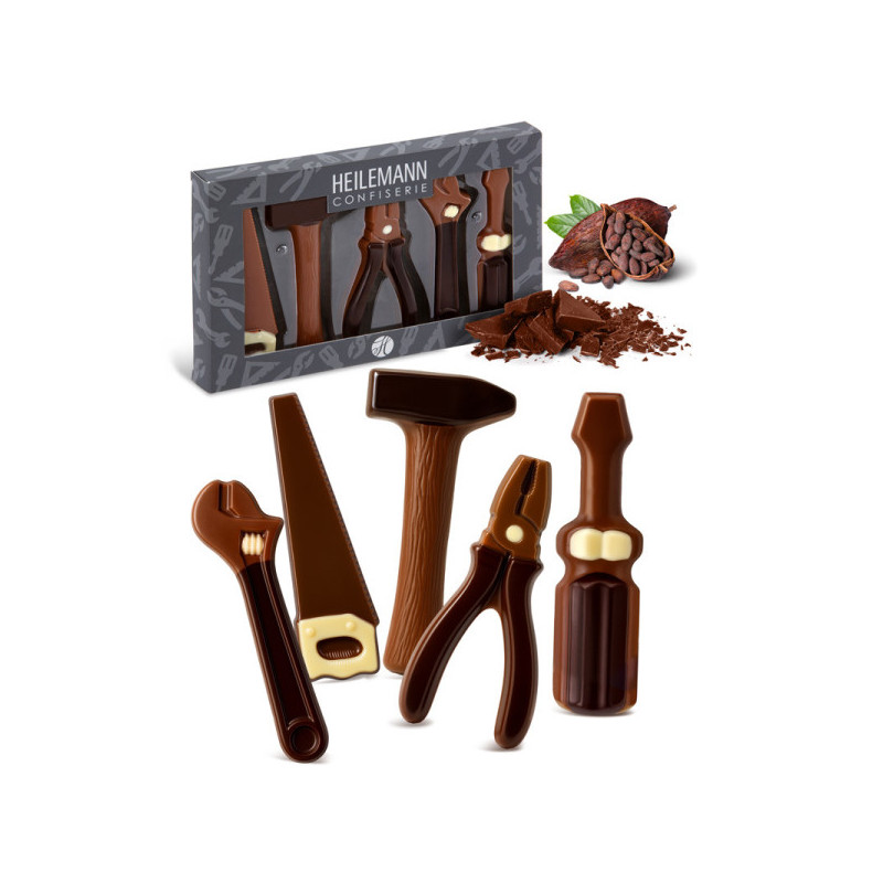 Dárková sada figurek z mléčné čokolády. Mléčná čokoláda dekorovaná bílou a hořkou čokoládou.