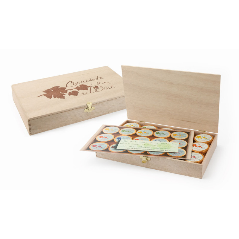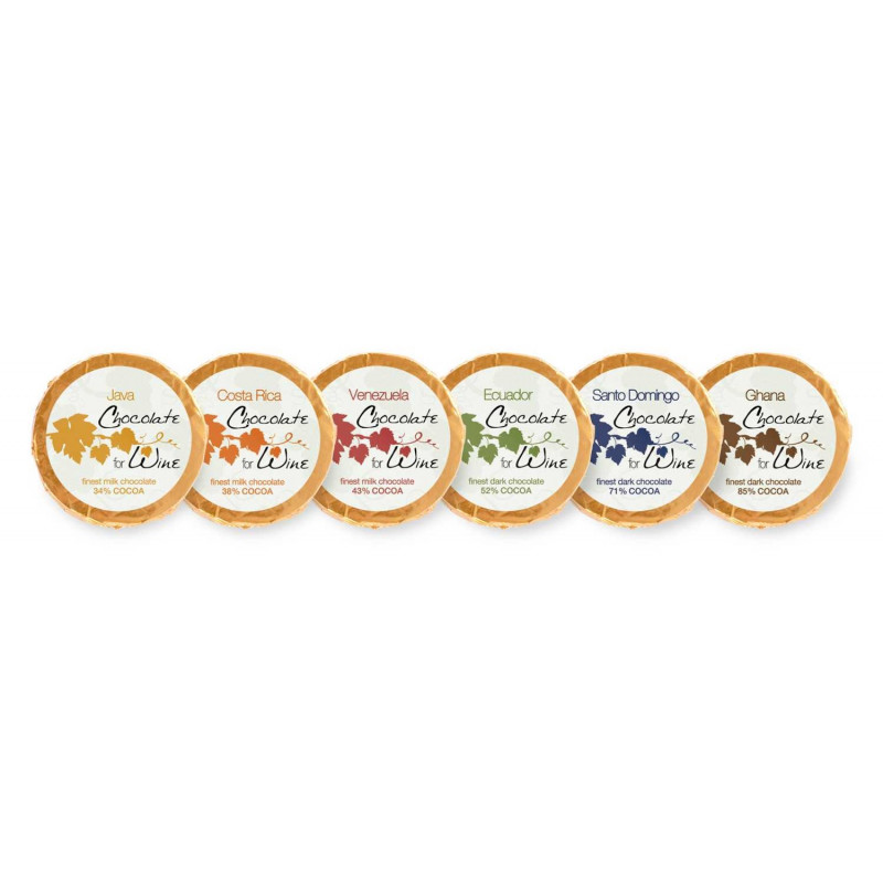 Čokoláda k vínu. Čokoládové dublony z mléčné nebo hořké čokolády s označením země původu a minimálního podílu kakaa.