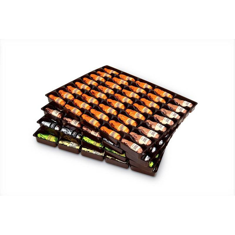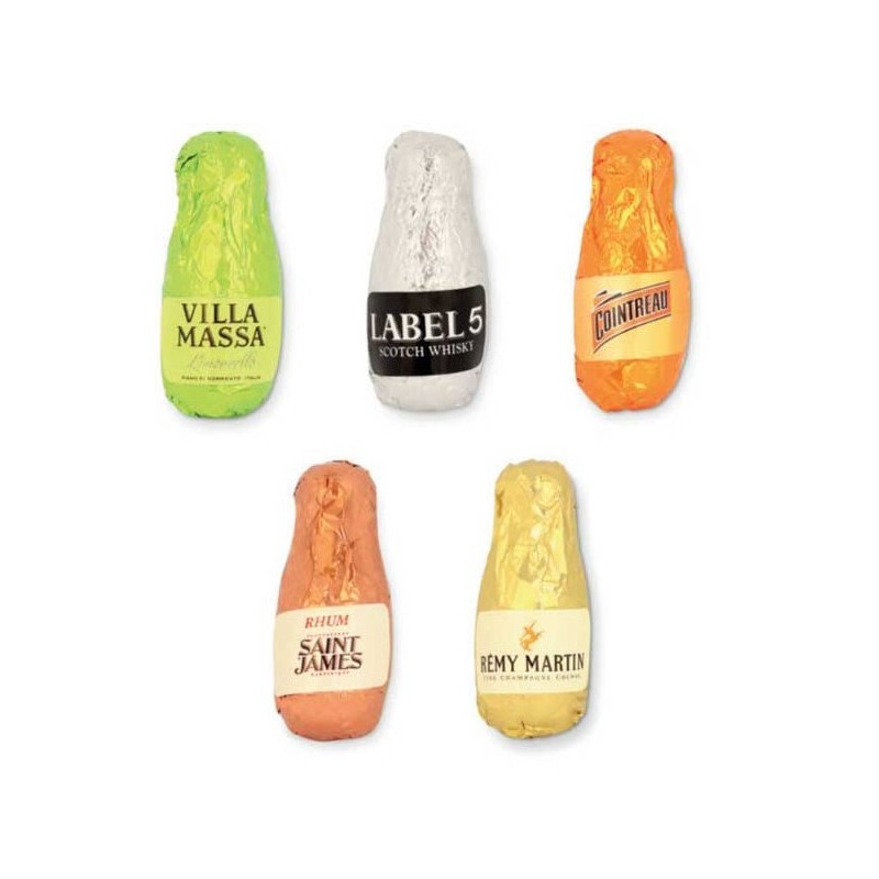 Balení lahviček z hořké čokolády (12,5 g) s alkoholovou náplní (tekutou) pro kusový prodej. Obsah balení: 4 x 40 ks.