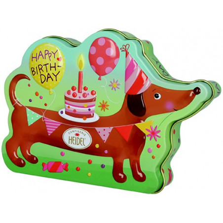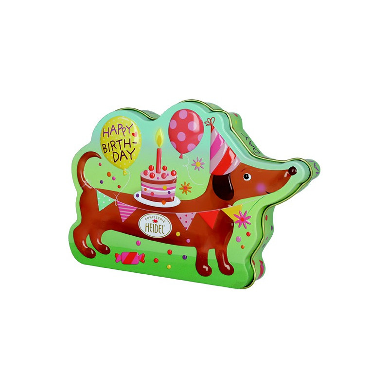 Kovová dóza s jezevčíkem, obsahující plněnou mléčnou čokoládu.