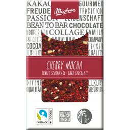 Hořká čokoláda zdobená višněmi, bílou čokoládou a kávou.