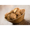 Složení: Arašídové máslo (60 %) [ARAŠÍDY, rostlinný olej (palmový olej), maltodextrin, cukr, sůl, antioxidant: extrakt z rozmarýnu], PŠENIČNÁ mouka (obsahuje LEPEK), rostlinný olej (hydrogenovaný palmový olej), SÓJOVÁ mouka, MANDLE, SEZAMOVÁ SEMIENKA, sůl, kakaová hmota, cukr, kakaové máslo, plnidla: hydrogenuhličitan sodný, aromata: vanilin, emulgátor: SÓJOVÝ lecitin, barviva: skořice, sůl. Může obsahovat stopy: siřičitanů, lepku, mléka, vajec, sóji, sezamu, arašídů, skořápkových plodů.