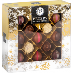 Balení pralinek z mléčné čokolády s ořechovým krémem a mandlí pro kusový prodej.