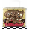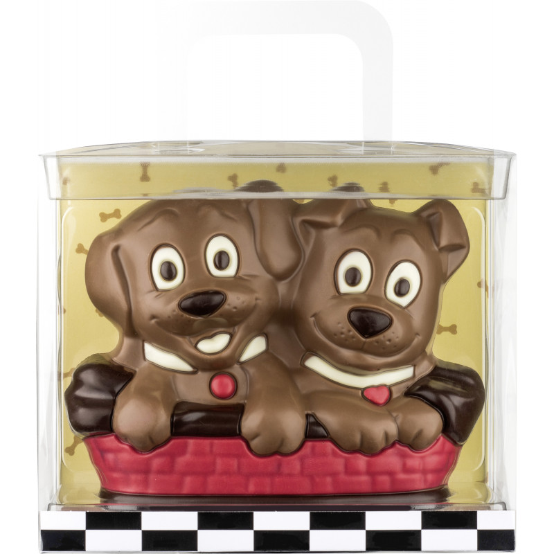 Figurka štěňat v košíku z jemné mléčné čokolády v dárkovém balení.