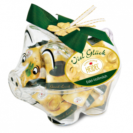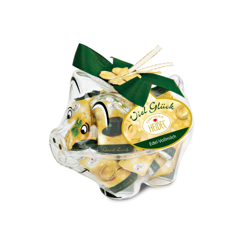 Prasátko pro štěstí plněné minitabulkami jemné mléčné čokolády (minimální podíl kakaové sušiny: 37 %). se symboly štěstí.