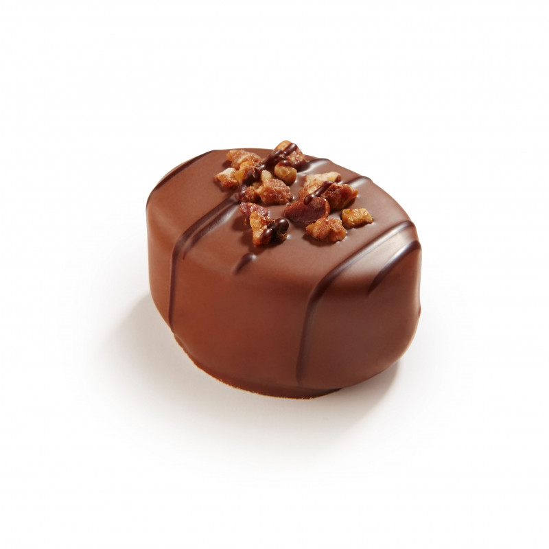 Cernotti – dekorovaná mléčná čokoláda plněná ganache s vlašskými ořechy s karamelizovanými pekanovými ořechy.