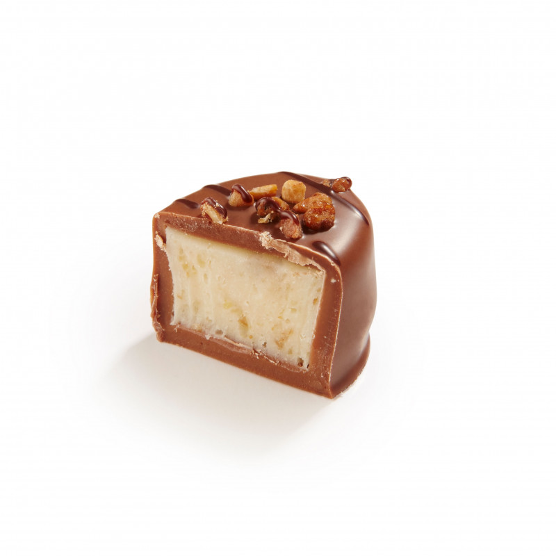 Pralinky z mléčné čokolády plněné krémem s vlašskými ořechy, zdobené pekanovými ořechy. Pro kusový prodej.