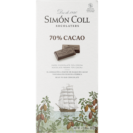 Extra jemná hořká čokoláda 70% bez lepku. Vyrobeno „od bobu po tabulku“.