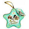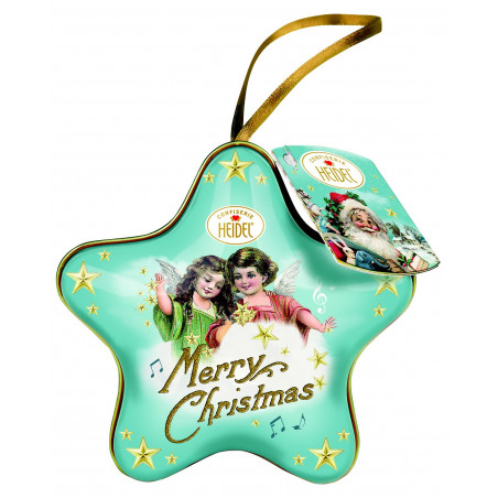 Vánoční dárkové balení pralinek z mléčné čokolády s náplní "Praliné" v atraktivním kovovém pouzdru ve tvaru hvězdy. Opatřeno poutkem k zavěšení.
