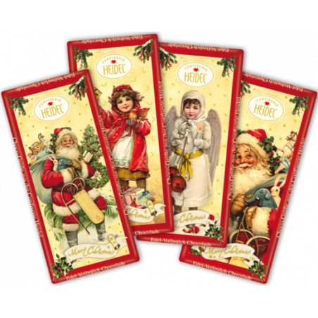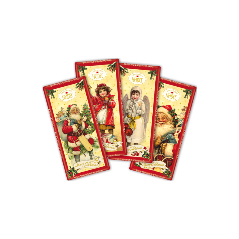 Jemná mléčná čokoláda (minimální podíl kakaové sušiny 37 %) ve vánočním přebalu (různé motivy).