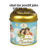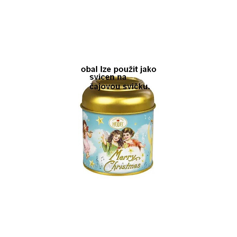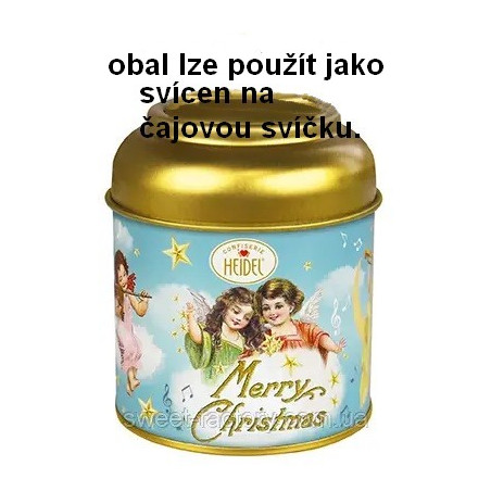 Kovové pouzdro ve tvaru svícnu s obsahem mléčné čokolády s náplní Praliné.