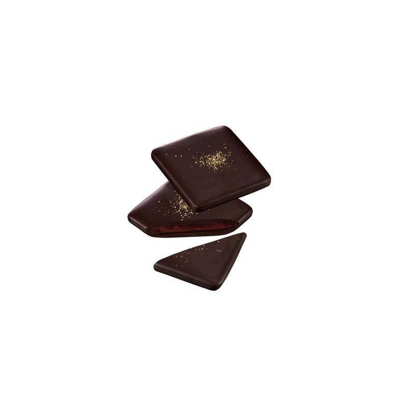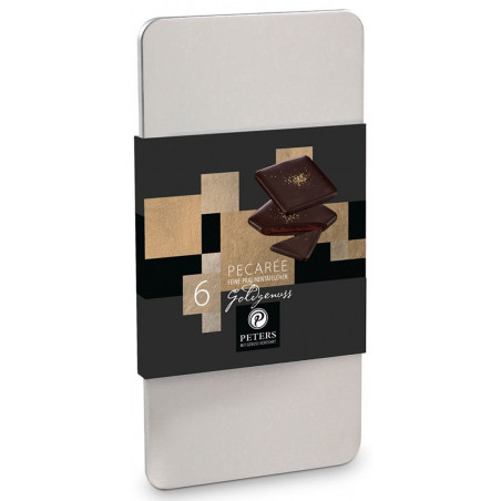 Jemná plněná hořká čokoláda dekorovaná zlatým prachem.