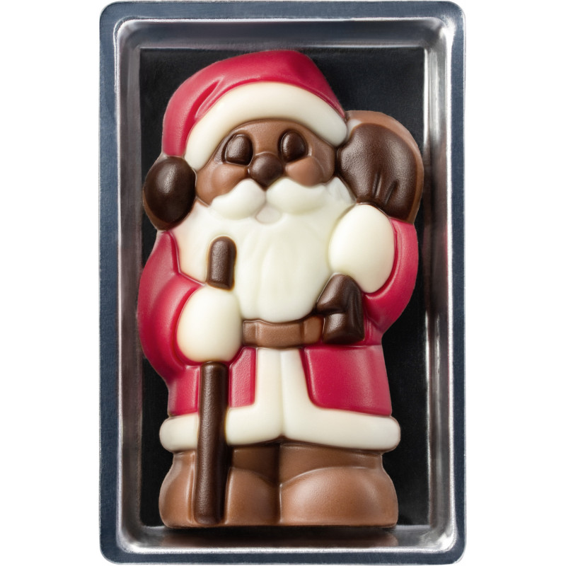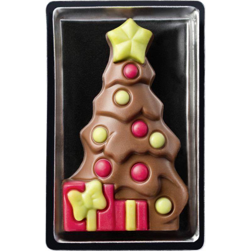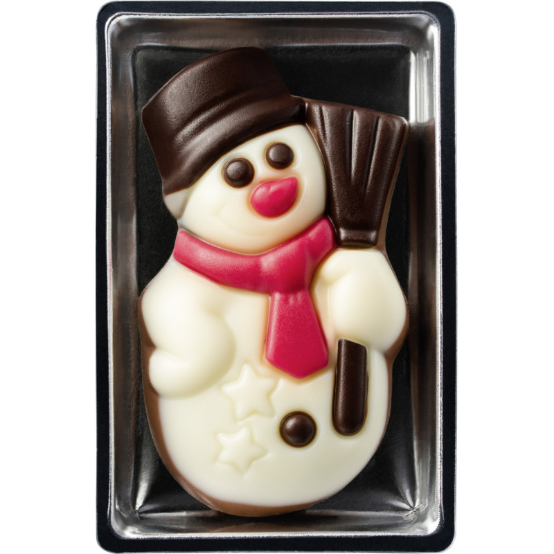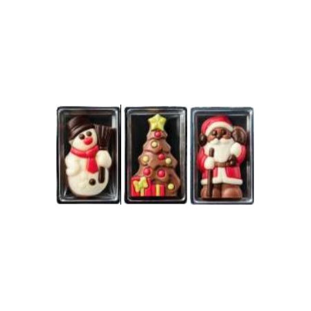 Reliéf z mléčné čokolády Santa, Sněhulák, Stromeček. Dekorovano. Minimální podíl kakaové sušiny: 36%.