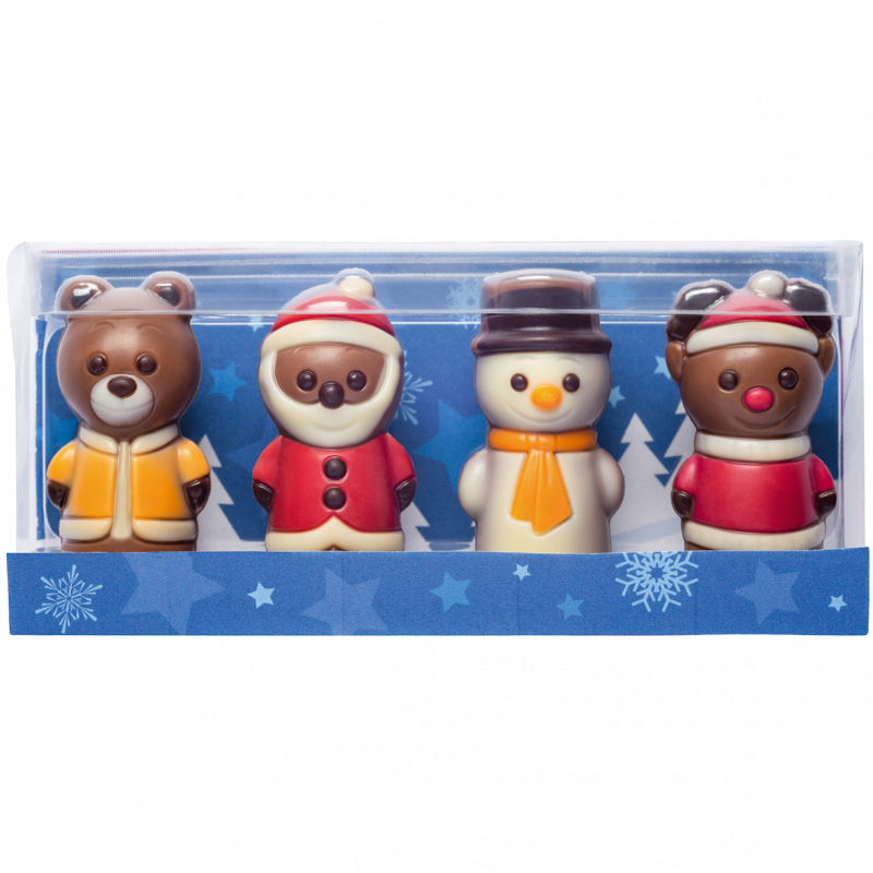Dárková sada figurek z mléčné čokolády (minimální podíl kakaové sušiny: 36 %), dekorované. Složení: cukr, kakaové máslo, sušené plnotučné mléko (18 %), kakaová hmota, sušená smetana, emulgátor: sójový lecitin; vanilkový extrakt, barvivo dekorační hmoty: karmín, paprikový extrakt. Nutriční hodnoty ve 100 g: energetická hodnota 2405 kJ / 577 kcal, tuk 38g (nasycené mastné kyseliny 23g), sacharidy 53g (cukr 53g), bílkoviny 5,6g, sůl 0,16g. Možné stopy: lískové ořechy, mandle. Uchovejte v suchu a chladu, chraňte před slunečním svitem. Vyrobeno v Německu. Dovozce: Chocotherapia s.r.o, Loosova 1, 638 00 Brno. Hmotnost: 40 g. Minimální trvanlivost do: viz obal.