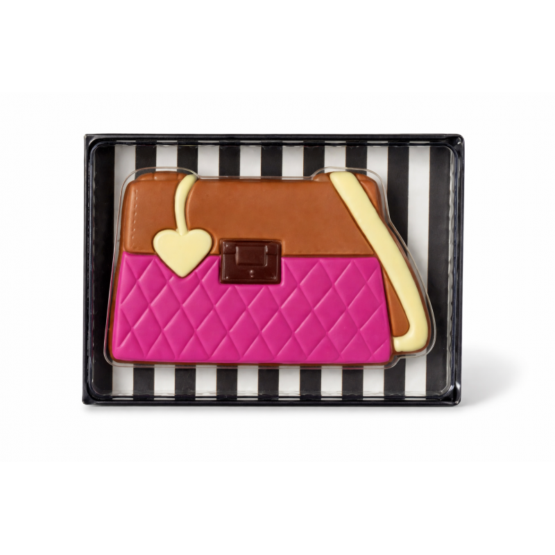 Kabelka - dárkové balení jemné mléčné čokolády, dekorované. Minimální podíl kakaové sušiny: 36 %.